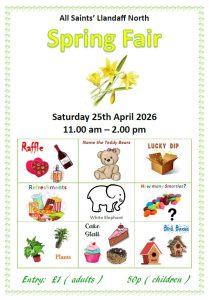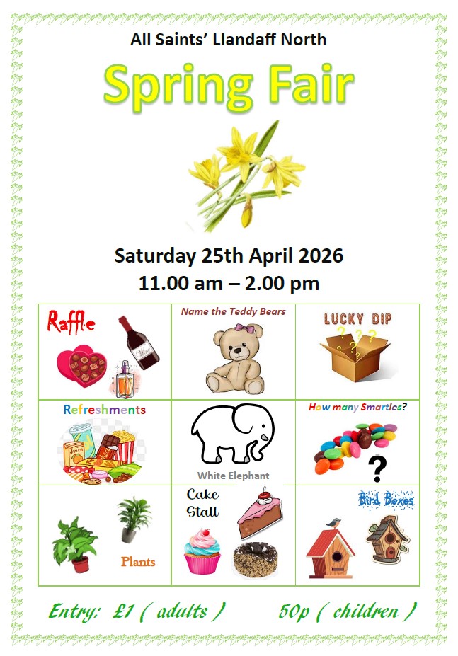 Social Events See below for some posters relating to upcoming events. Click on the image for the full size poster. ALL SAINTS’ LLANDAFF NORTH SPRING FAIR COFFEE & CAKE EVERY WEDNESDAY CITY RINGERS – HANDCHIMES
